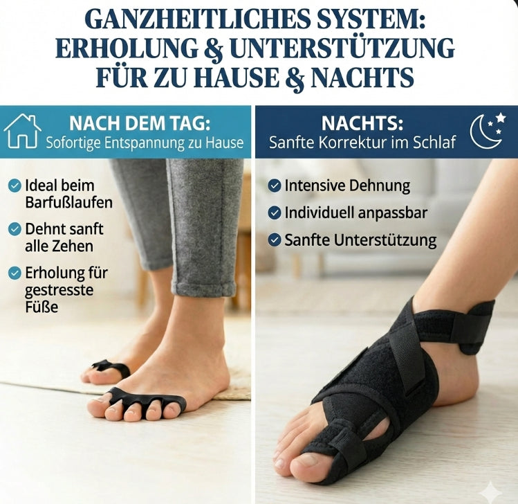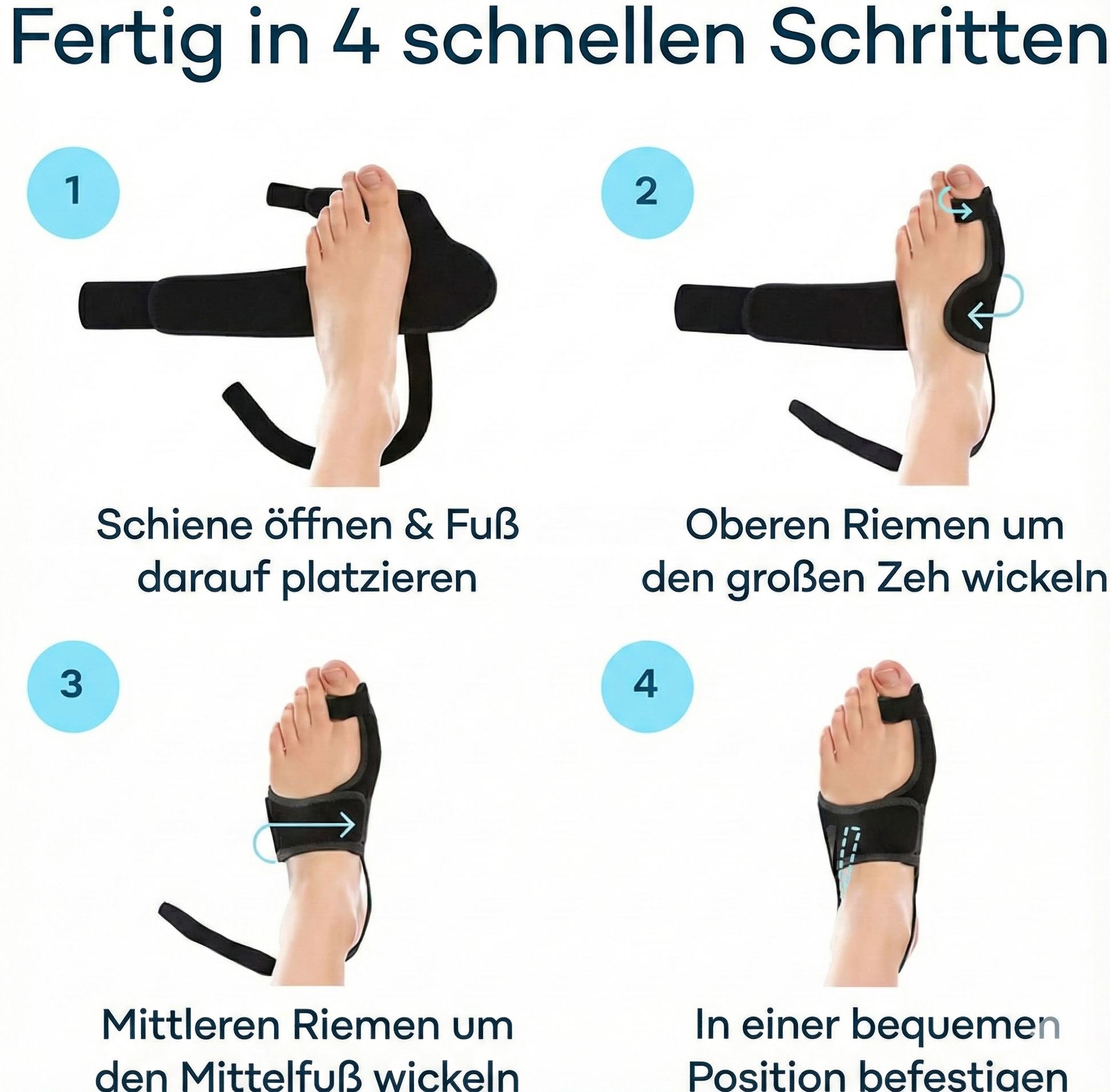 Viele Kunden berichten schon nach den ersten Anwendungen von einer deutlichen Entlastung des Druckgefühls am Abend. Da sich eine Fehlstellung über Jahre entwickelt hat, braucht auch die sanfte Führung Zeit. Kontinuität ist der Schlüssel: Tragen Sie das Set täglich für optimale Ergebnisse.
