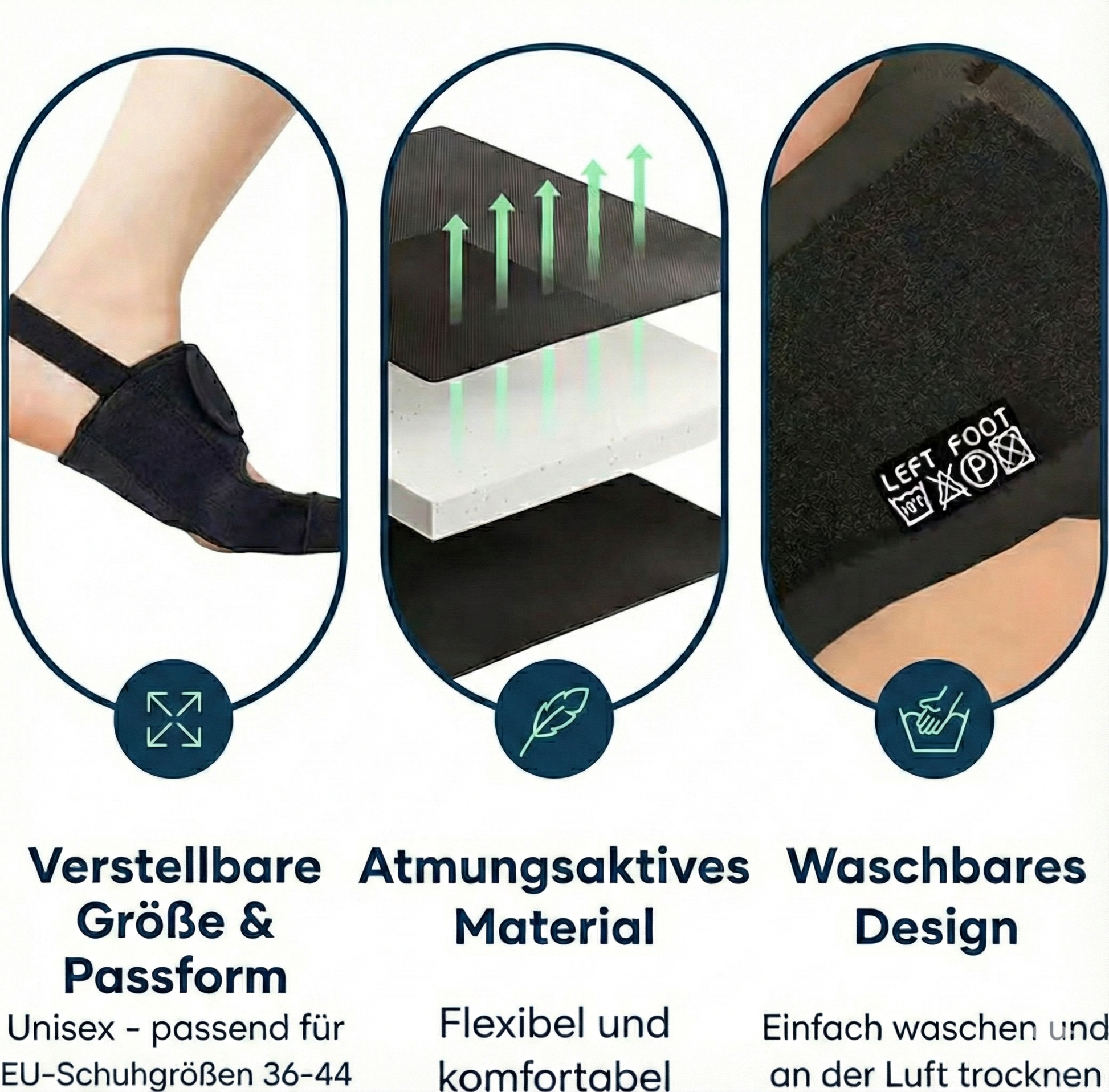 Wir verwenden hautfreundliche, atmungsaktive Materialien, um Hitzestau zu vermeiden. Das Design der Nachtschiene ist offen gestaltet, sodass viel Luft an den Fuß kommt. Die Silikon-Spreizer sind leicht abwaschbar und hygienisch, sodass Schweißbildung kein Problem darstellt.